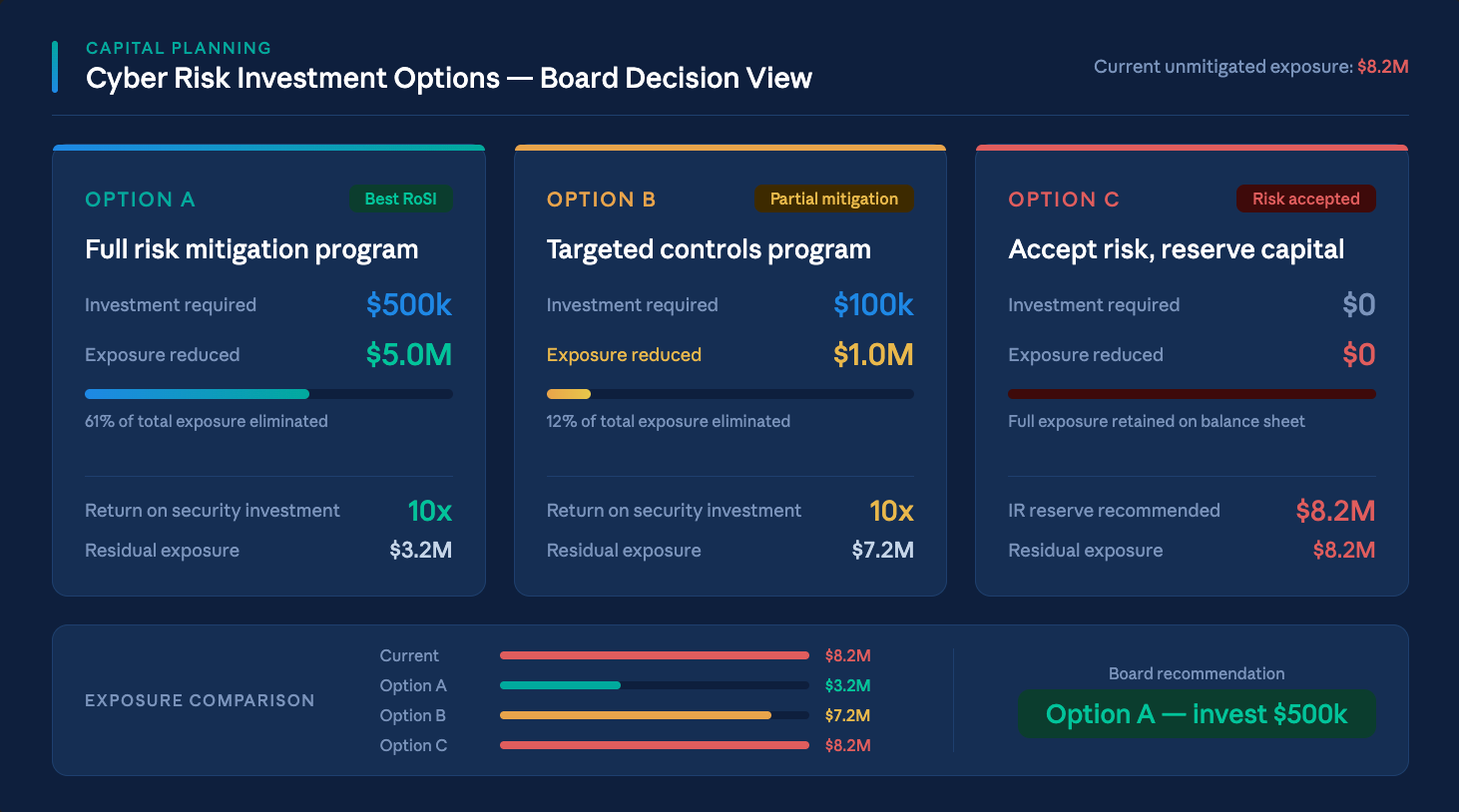 - Option A: Invest $500k to reduce financial exposure by $5M.