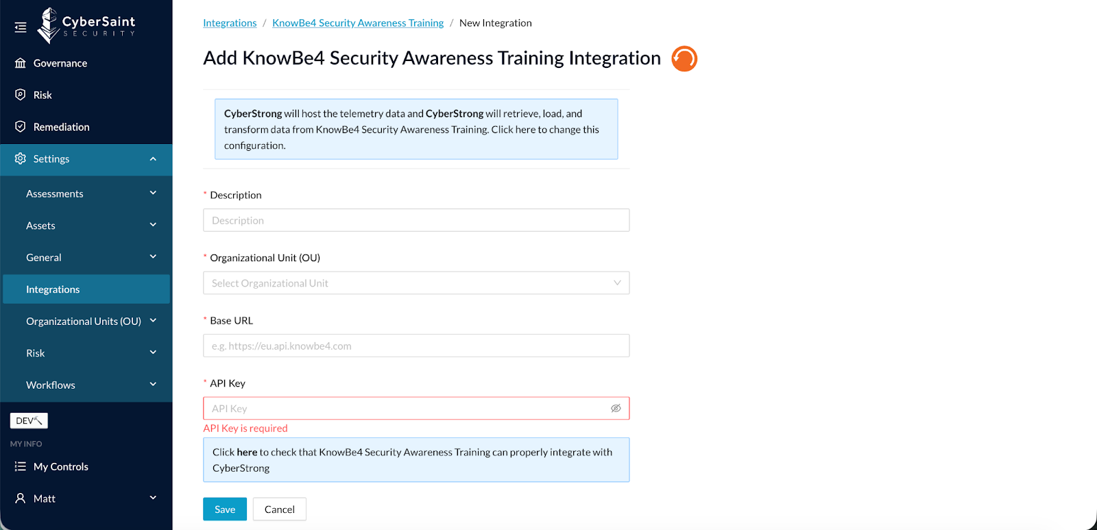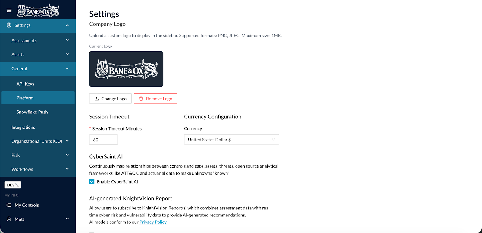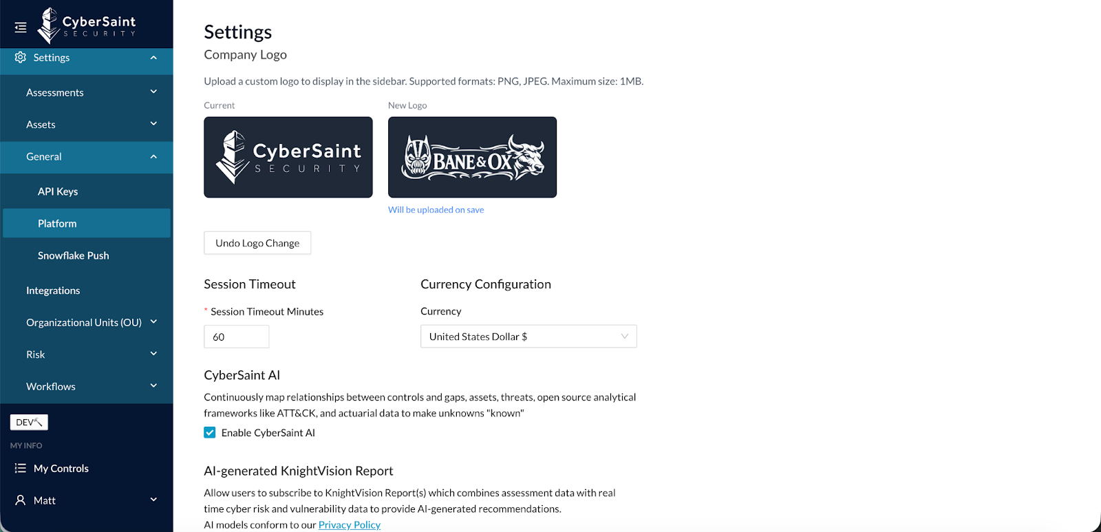 Clients wanted a way to brand their CyberStrong instance. Previously, the logo was CyberSaint’s and could not be updated.