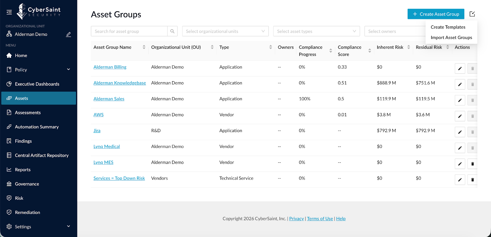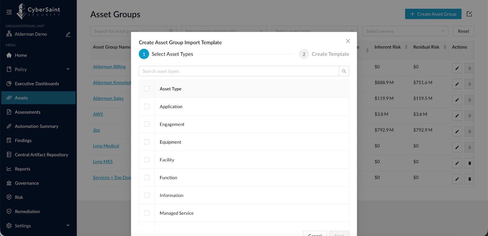 - Next to “Create Asset Group” in the Assets view, you can either create an Import Template or Import Asset Groups. By creating an import template, you can select which Asset Types to import, and the system will build the proper template for the data.